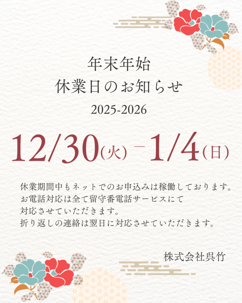 いつもお世話になり、ありがとうございます。本年(2025年)から2026年の年末年始のご案内をさせていただきま…